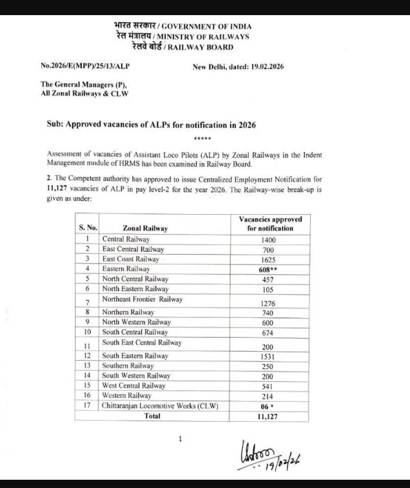 Railway Recruitment Board (RRB) has just cleared a massive 11,127 Assistant Loco Pilot (ALP) posting for the 2026‑27 recruitment cycle. Issued through Railway Board letter No. 2026(E/MPP)/25/13/ALP on 19 February 2026, the sanction covers all 17 Zonal Railways plus the Chittaranjan Locomotive Works (CLW). This approval marks one of the largest technical recruitments in Indian Railways, offering 10th + ITI/Diploma‑qualified aspirants a stable government career with Level‑2 (7th CPC) pay. While the official Centralised Employment Notification (CEN 2026) is still pending, the vacancy numbers, pay scale and zone‑wise distribution are now public. Candidates should keep an eye on the upcoming notification for exact eligibility, fee structure and application dates.